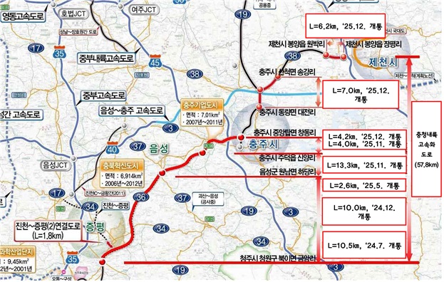 지난해 7월 충청내륙고속화도로 1-1공구(10.5㎞) 개통을 시작으로 잔여구간이 개통됨에 따라 충청내륙고속화도로는 2017년 첫 삽을 뜬 지 8년 만에 57.8㎞ 구간이 완전 개통됐다.